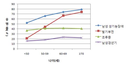 ¹ß±âºÎÀü, Á¶·çÁõ, ³²¼º°»³â±â Áß ÇÑ °¡Áö ÀÌ»óÀÇ ¼º±â´ÉÀå¾Ö¸¦ °®°í ÀÖ´Â ºñÀ²Àº 40´ë 52.1%, 50´ë 65.8%, 60´ë 73.8%, 70´ë ÀÌ»ó 79.0%·Î ¿¬·ÉÀÌ Áõ°¡ÇÒ¼ö·Ï Áõ°¡ÇÏ´Â °æÇâÀ» º¸¿´´Ù.