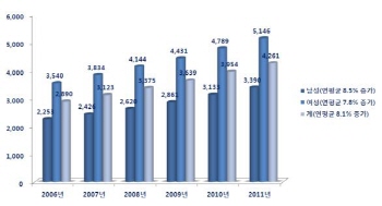 Áø·á¸¦ ¹ÞÀº ȯÀÚ¼ö´Â 2006³â 137¸¸¸í¿¡¼ 2011³â 210¸¸¸í(Àüü Àα¸ÀÇ 4.3%)À¸·Î ÃÖ±Ù 6³â µ¿¾È ¿¬Æò±Õ 8.9%°¡ Áõ°¡Çß´Ù. ³²¼ºÀº 2006³â 53¸¸9õ¸í¿¡¼ 2011³â 84¸¸2õ¸íÀ¸·Î ¿¬Æò±Õ 9.3%°¡ Áõ°¡ÇÏ¿´°í, ¿©¼ºÀº 2006³â 83¸¸1õ¸í¿¡¼ 2011³â 125¸¸9õ¸íÀ¸·Î ¿¬Æò±Õ 8.7%°¡ Áõ°¡Çß´Ù. ¶ÇÇÑ, Àα¸ 10¸¸¸í´ç Áø·áÀοø ¿¬Æò±Õ Áõ°¡À²Àº ³²¼º 8.5%, ¿©¼º 7.8%·Î ³ªÅ¸³µ´Ù. 2011³âÀ» ±âÁØÀ¸·Î ¡®¿À½Ê°ß µî ¾î±úÅëÁõ¡¯À¸·Î ÀÎÇÑ Áø·áȯÀÚ¸¦ »óº´º°·Î ºÐ·ùÇϸé Àüü Áø·áȯÀÚ 210¸¸¸í Áß 74¸¸¸í(35%)Àº ¡®¾î±úÀÇ À¯Âø¼º ÇǸ·¿°¡¯À¸·Î Áø·á¸¦ ¹Þ¾ÒÀ¸¸ç, 40¸¸6õ¸í(19%)Àº ¡®±ÙÀ°µÑ·¹¶ì ÁõÈıº¡¯, 31¸¸1õ¸í(15%)Àº ¡®»ó¼¼ºÒ¸íÀÇ ¾î±úº´º¯¡¯À¸·Î Áø·á¸¦ ¹Þ¾Ò´Ù.