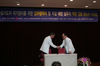 ±¤Áֽà Àڻ쿹¹æ¼¾ÅÍ(¼¾ÅÍÀå ¹Ú»óÇÐ)¿Í Á¶¼±´ëº´¿ø(¿øÀå ¹Î¿µµ·)Àº 24ÀÏ ¿ÀÈÄ1½Ã Á¶¼±´ë Àǰú´ëÇÐ ÀǼº°ü¿¡¼ ÀÀ±ÞÀÇ·á±â°ü¿¡ ³»¿øÇÑ ÀÚ»ì½ÃµµÀÚ¿¡ ´ëÇÑ ½Å¼ÓÇÑ ´ëÀÀü°è¿Í »çÈİü¸®Ã¼°è ±¸ÃàÀ¸·Î ÀÚ»ìÀÇ Àç½Ãµµ ¹æÁö¸¦ À§ÇÑ Çù¾àÀ» ü°áÇß´Ù. À̹ø Çù¾à¾È¿¡ µû¸£¸é ¡ãÀÚ»ìÀ§Çè¿¡ ³ëÃâµÈ ÀÚ¿¡ ´ëÇÑ Áï°¢ÀûÀÎ Ä¡·á¿Í »ó´ã ¼ºñ½º Á¦°ø ¡ãÀÀ±ÞÀÇÇаú¿Í Á¤½Å°Ç°ÀÇÇаú, ±×¸®°í Àڻ쿹¹æ¼¾ÅÍÀÇ À¯±âÀûÀÎ ¿¬°èü°è ±¸Ãà ½Ã½ºÅÛÀ» ÅëÇÑ Áú ³ôÀº »çÈİü¸® ¼ºñ½º Á¦°ø ¡ãÀڻ쿹¹æ¼¾ÅÍ Àü¹®°¡ ³»¼Ò »ó´ã »ó½Ã¼ºñ½º ±¸Ãà ¡ã°øµ¿ ¿¬±¸-Á¶»ç »ç¾÷ ¹× °øµ¿ Çмú´ëȸ °³ÃÖ µî Áö¿ª»çȸ »ý¸íÁ¸Áß ¹®È Á¶¼º »ç¾÷¿¡ Àû±Ø ÇùÁ¶ÇÏ´Â ³»¿ëÀ» ´ã°í ÀÖ´Ù. ¶ÇÇÑ Àڻ쿹¹æ Àü¹®°¡µéÀÇ ½Ç¹«´É·ÂÀ» Çâ»ó½ÃÄÑ ÀÚ»ì»ç¸ÁÀÚ¸¦ ÁÙÀ̰í ÀÚ»ì »ç¸Á·üÀ» °¨¼Ò½Ã۱â À§ÇØ Áö¿ª»çȸ Àڻ쿹¹æÀü¹®°¡µéÀÌ Âü¼®ÇÑ °¡¿îµ¥ Àڻ쿹¹æ ¿öÅ©¼óµµ ÁøÇàµÆ´Ù. À̳¯ ¿öÅ©¼óÀº ¡ã±¤Áֽà Àڻ쿹¹æ¼¾ÅÍ ÁÖ¿ä »ç¾÷¼Ò°³(¼¾ÅÍÀå ¹Ú»óÇÐ) ¡ãÀÀ±ÞÀÇ·á±â°üÀÇ ÀÚ»ì½ÃµµÀÚ »çÈİü¸®(¿øÁÖÁ¤½Åº¸°Ç¼¾ÅÍÀå ¹Î¼ºÈ£) ¡ãÁö¿ª»çȸ ³×Æ®¿öÅ© ±¸ÃàÀ» ÅëÇÑ Àڻ쿹¹æ»ç¾÷ÀÇ ½ÇÁ¦(ȼº½Ã Á¤½Åº¸°Ç¼¾ÅÍ)¡¯ µîÀÇ ÁÖÁ¦·Î °³ÃÖÇß´Ù. ±¤Áֽà ¹Ú»óÇÐ Àڻ쿹¹æ¼¾ÅÍÀåÀº ¡°À̹ø ¾÷¹«Çù¾à°ú ¿öÅ©¼ó °³ÃÖ¸¦ ÅëÇØ ÀÚ»ì½ÃµµÀÚ¿Í ±× °¡Á·, ¿ì¸® ÀÌ¿ôÀÇ ÀÀ±ÞÁ¶Ä¡¿Í È¿°úÀûÀ¸·Î À§±â°ü¸®¿¡ ´ëóÇÏ´Â ±âȸÀÇ ÀåÀÌ µÆÀ¸¸é ÇÑ´Ù¡±¸ç ¡°¿ì¸® ¼¾ÅÍÀÇ ±Ã±ØÀû ¸ñÇ¥´Â °Ç°ÇÑ ±¤ÁֽùΠ¸ðµÎ°¡ °³ÀÎÀº ¹°·Ð ÀÌ¿ôÀÇ »ý¸íÀ» ¼ÒÁßÇÏ°Ô »ý°¢Çϰí, ¾ÈŸ±î¿î ÁÖ°ËÀÌ ´Ü ÇѰǵµ ¹ß»ýÇÏÁö ¾Êµµ·Ï ¸ðµÎ°¡ ¼ÕÀ» ³»¹Ð¾î »ý¸íÀÇ ÁöÅ´À̰¡ µÇ´Â ³¯±îÁö ÇÔ²² ÈûÀ» ¸ð¾Æ °¡¾ß ÇÑ´Ù¡±°í °Á¶Çß´Ù.