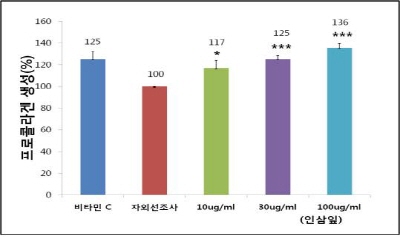 ¸ÕÀú, ÇÁ·ÎÄݶó°ÕÀº Äݶó°Õ »ý¼ºÀ¯µµ¹°Áú·Î ³ëÈ¿Í ÇǺÎÁÖ¸§ ¹æÁö¿¡ Áß¿äÇѵ¥, µ¿¹° ½ÇÇè°á°ú Àλï ÀÙÀº ÇÁ·ÎÄݶó°Õ »ý¼ºÀÌ ¿ì¼öÇÑ °ÍÀ¸·Î È®ÀεƴÙ. Áï, Àλï ÀÙ ÃßÃâ¹°À» 100¥ìg/ml ÅõÀÔÇßÀ» ¶§ ´ëÁ¶±ºº¸´Ù ÇÁ·ÎÄݶó°ÕÀÌ 36 % ´õ »ý¼ºµÇ´Â °ÍÀ¸·Î ³ªÅ¸³µ´Ù. ¶ÇÇÑ Äݶó°ÕÀ» Çü¼ºÇÏ´Â Áß¿äÇÑ ¿µ¾ç¼ººÐÀÎ ºñŸ¹ÎC¸¦ ÅõÀÔÇßÀ» ¶§º¸´Ù ÇÁ·ÎÄݶó°Õ »ý¼ºÀÌ ´õ ¿ì¼öÇÑ °ÍÀ¸·Î Á¶»çµÆ´Ù. ´õºÒ¾î, ź·Â¼º ´Ü¹éÁú ºÐÇØ¿ä¼ÒÀÎ ¿¤¶ó½ºÅ¸Á¦´Â ž籤¿¡ ³ëÃâµÇ¸é Ȱ¼ºÀÌ Áõ°¡ÇØ ÇǺÎÀÇ Åº·ÂÀÌ ¶³¾îÁö°í ÁÖ¸§ÀÌ ¸¸µé¾îÁö´Â ¿øÀÎÀÌ µÈ´Ù. ½ÇÇè°á°ú, Àλï ÀÙÀº ¿¤¶ó½ºÅ¸Á¦ÀÇ È°¼ºÀ» ´ëÁ¶±ºº¸´Ù 26 % ´õ ³·ÃçÁֱ⿡ ÁÖ¸§°³¼±¿¡ È¿°úÀûÀÎ °ÍÀ¸·Î ³ªÅ¸³µ´Ù. »Ó¸¸ ¾Æ´Ï¶ó, Àڿܼ±À» ¹Þ´Â ÇǺÎÀÇ °¢ÁúÃþÀº ºÒ±ÔÄ¢ÇÏ°í µÎ²¨¿öÁö´Âµ¥, 200mg/mlÀÇ Àλï ÀÙÀ» 8ÁÖµ¿¾È ¹Ù¸¥ ÈòÁã ÇǺÎÀÇ °¢Áú¼¼Æ÷´Â ¾ã°í ÇǺÎÇ¥¸éÀº ¸Å²ô·¯¿öÁö´Â °ÍÀ¸·Î Á¶»çµÆ´Ù.