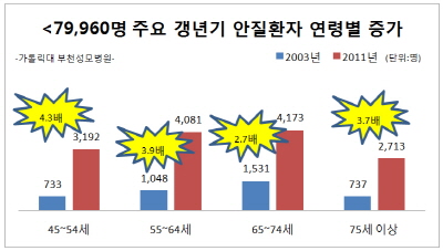 ºÎõ¼º¸ðº´¿ø ¾È°ú °³²¿© ±³¼öÆÀÀº ÃÖ±Ù ¾È¼¾ÅÍ °³¼Ò¸¦ ±â³ä, 2003³âºÎÅÍ 2011³â±îÁö ÁÖ¿ä °»³â±â ¾ÈÁúȯ(¾È±¸°ÇÁ¶, ¹é³»Àå, ³ì³»Àå, Ȳ¹ÝÁúȯ) ȯÀÚ Áõ°¡Ãß¼¼¸¦ Á¶»ç, ¹ßÇ¥Çß´Ù. ±× °á°ú, °»³â±â ¾ÈÁúȯÀ¸·Î ³»¿øÇÑ 45¼¼ ÀÌ»ó ȯÀÚ´Â ÃÑ 79,960¸íÀ̸ç, 2003³â 4,049¸í¿¡¼ 2011³â¿¡´Â 14,159¸íÀ¸·Î ´Ã¾î³ª 8³â »õ 3.5¹è ÀÌ»ó ±ÞÁõÇÑ °ÍÀ¸·Î ³ªÅ¸³µ´Ù.