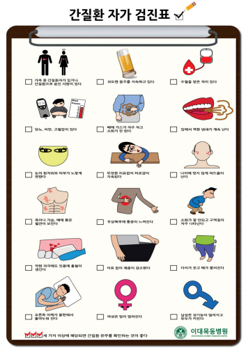 ÀÌ´ë¸ñµ¿º´¿ø °£¼¾ÅÍ(¼¾ÅÍÀå, À¯±Ç ±³¼ö)´Â °£Áúȯ¿¡ ´ëÇÑ ÀÌÇØ¸¦ µ½°íÀÚ ¡®°£Áúȯ ÀÚ°¡ °ËÁøÇ¥¡¯¸¦ 11ÀÏ ¹ßÇ¥Çß´Ù. Ç¥´Â °£ÁúȯÀÇ À§ÇèÀÎÀÚ¿Í µ¿¹Ý Áõ»ó 18°¡Áö¸¦ ½±°Ô ÀÌÇØÇÒ ¼ö ÀÖ´Â ±×¸²°ú ÇÔ²² ³ªÅ¸³»°í ÀÖ´Ù.