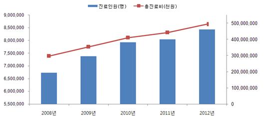 ÃÑÁø·áºñ´Â 2008³â ¾à 2,970¾ï¿ø¿¡¼ 2012³â ¾à 4,936¾ï¿øÀ¸·Î 5³â»õ ¾à 1,966¾ï¿øÀÌ Áõ°¡(66.2%)Çß°í ¿¬Æò±Õ Áõ°¡À²Àº 10.7% ¼öÁØÀ̾ú´Ù.