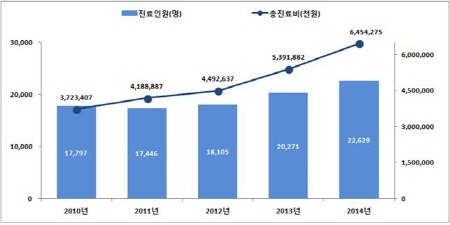 - Áø·áÀοøÀº 2010³â ¾à 1¸¸8õ¸í¿¡¼ 2014³â ¾à 2¸¸3õ¸íÀ¸·Î 5³â Àü¿¡ ºñÇØ ¾à 5õ¸í Áõ°¡ÇÏ¿© ¿¬Æò±Õ Áõ°¡À²Àº 6.2%À̸ç, - ÃÑ Áø·áºñ´Â 2010³â ¾à 37¾ï¿ø¿¡¼ 2014³â ¾à 65¾ï¿øÀ¸·Î 5³â Àü¿¡ ºñÇØ ¾à 27¾ï¿øÀÌ Áõ°¡ÇÏ¿© ¿¬Æò±Õ Áõ°¡À²Àº 14.7%¸¦ º¸¿´´Ù.
