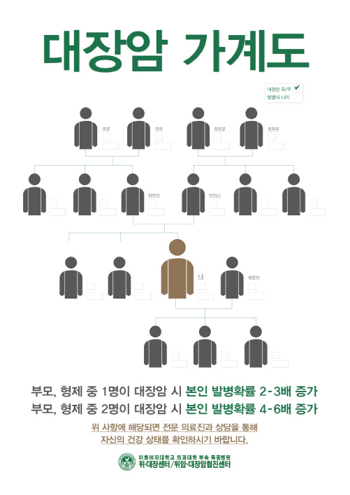 ¡®´ëÀå¾Ï °¡°èµµ¡¯´Â Á¶ºÎ¸ð, ¿ÜÁ¶ºÎ¸ð, ºÎ¸ð, ÇüÁ¦¡¤ÀڸеîÀÇ ´ëÀå¾Ï ¹ßº´ À¯¹«¿Í ¹ßº´ ³ªÀ̸¦ ½º½º·Î ÀÛ¼ºÇÒ ¼ö ÀÖµµ·Ï ±¸¼ºµÆ´Ù. ÇöÀç À¯Àü¼ºÀÌ ¹àÇôÁø ¾ÏÀº ´ëÀå¾Ï°ú À¯¹æ¾ÏÀÌ´Ù.